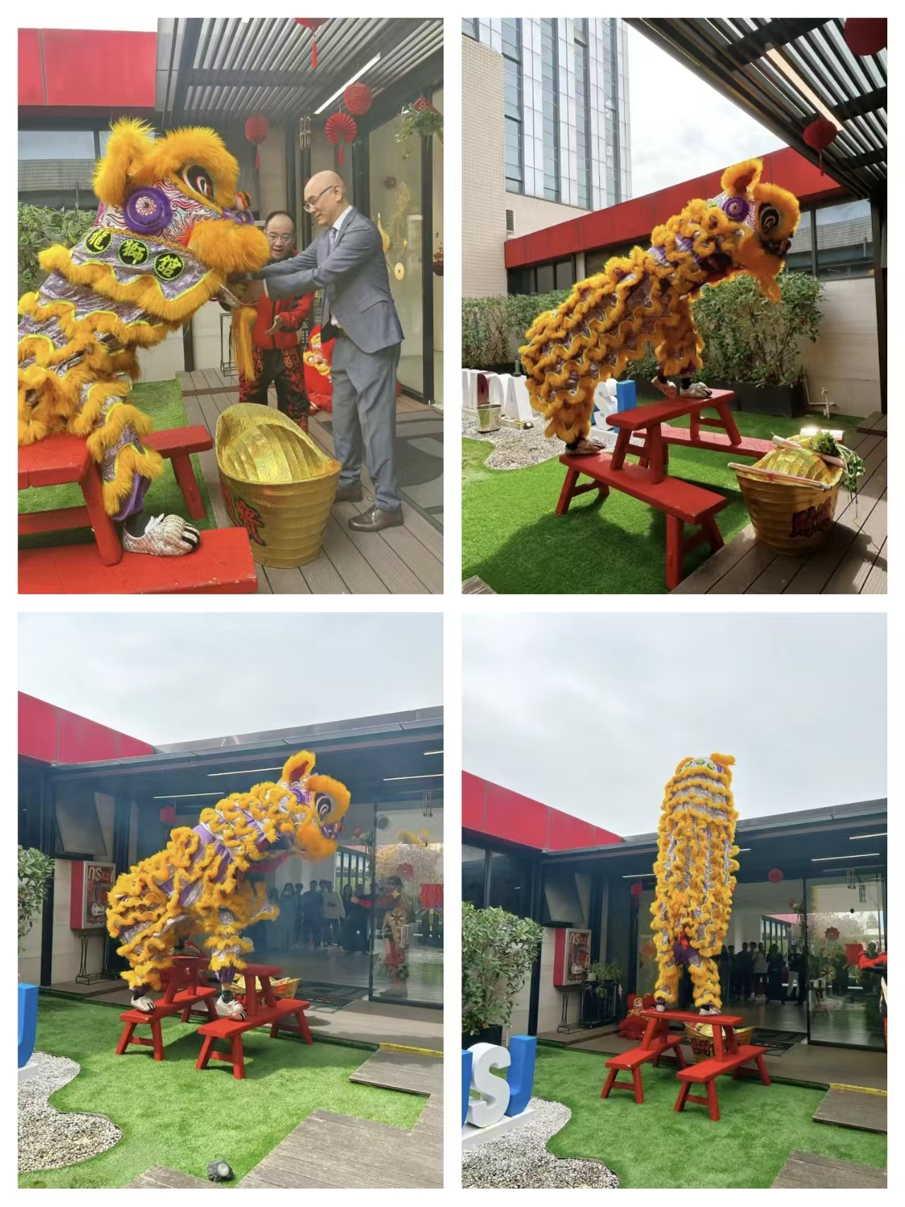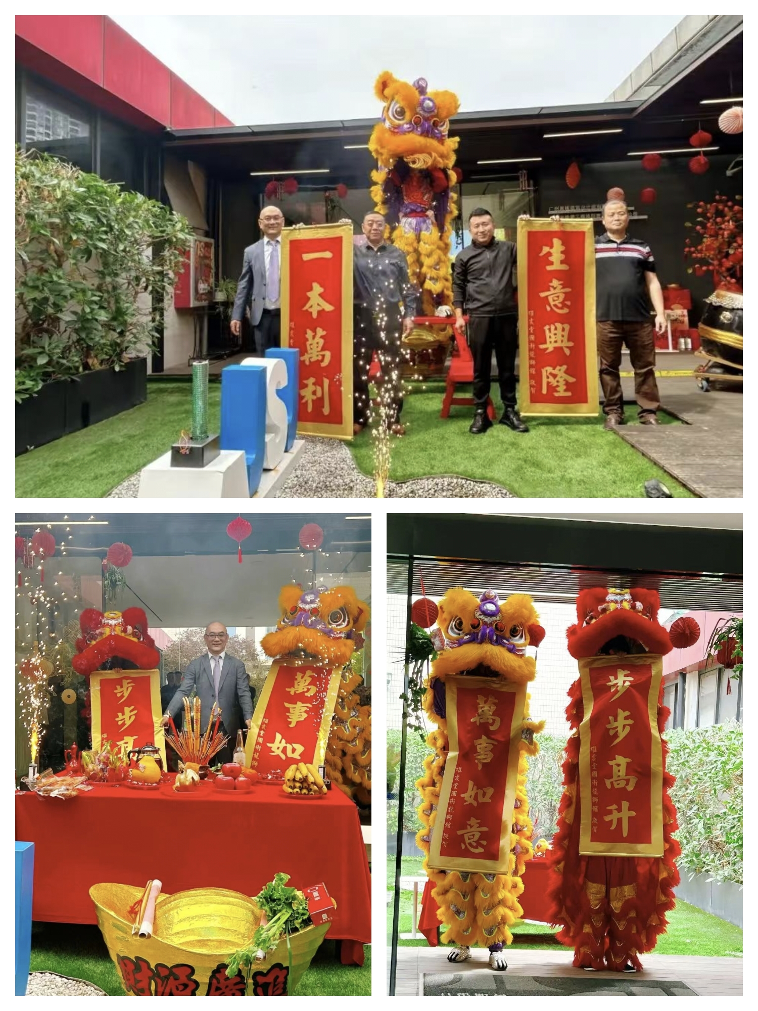 金鼓齐鸣驱晦气,祥瑞满堂纳福来。愿醒狮所至,皆是坦途,护佑公司上下生意兴隆,大展宏图!